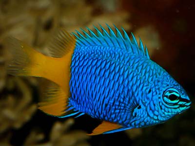 دارای رنگ های آبی و زرد بسیار درخشان است و گاهی با دامسل دم زرد اشتباه گرفته می شود. این ماهی رفتار نیمه تهاجمی داشته ولی برای راه اندازی آکواریوم های جدید گزینه خوبی است زیرا ماهی مقاومی است و با تغییرات شرایط آب به خوبی سازگار می شود. برای تغذیه این ماهی می توانید از انواع غذاهای گوشتی و جلبکی و یا حتی زئوپلانکتونی استفاده کنید.