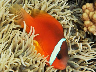مشابه اکثر دلقک ماهی ها این ماهی نیز می توانند در یک رابطه همزیستی زیبا با شقایق ها مختلف مثل Entacmaea quadricolor زندگی کند. برای نگهداری از این ماهی بهتر است از آکواریوم هایی با فضای زیاد استفاده شود به خصوص زمانی که دلقک ماهی های دیگر نیز در آکواریوم زندگی می کنند. برای نگهداری ایده آل از این ماهی بهتر است برای تغذیه آن از انواع غذاهای دریايي مثل میگو های کوچک فراوری شده و غذاهای آماده مخصوص دلقک ماهی ها استفاده شود.