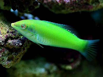 این ماهی با رنگ سبز بسیار درخشان به راحتی قابل شناسایی است. برای نگهداری از این ماهی به آکواریومی با ظرفیت حداقل 250 لیتر و بستری به عمق حداقل ۶ سانتی متر از ماسه نرم نیازدارید زیرا این ماهی برای مخفی شدن به زیر ماسه های بستر می رود. نگهداری از این ماهی در آکواریوم های فقط ماهی مناسب تر است زیرا این ماهی می تواند به انواع کرم های لوله ای، صدف ها و میگو ها آسیب وارد کند. شما می توانید از انواع میگو های کوچک آماده و همچنین غذاهای مخصوص ماهیان گوشت خوار و یا حتی تکه های بسیار کوچک میگو و ماهی غنی شده با ویتامین جهت تغذیه این ماهی استفاده کنید.