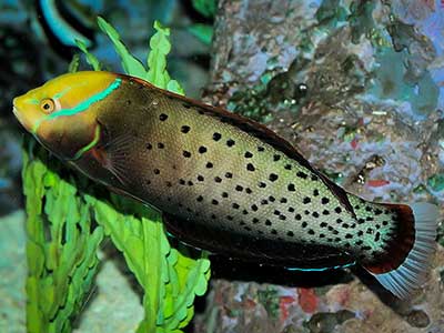 این ماهی قبل از بلوغ دارای بدنی نارنجی رنگ با خطوط سفید و لبه های مشکی است. بعد از بلوغ ماهی ماده دارای رنگی تیره با خال های سیاه است و ماهی نر دارای بدنی روشن با خط های آبی در اطراف سر می باشد. برای نگهداری از این ماهی به آکواریومی با ظرفیت حداقل 680 لیتر نیاز دارید که با صخره های زنده دکور شده باشد و بستری از ماسه حداقل به عمق ۱۰ تا ۱۵ سانتی متر داشته باشد. این ماهی شکارچی بسیار قهاری است و می تواند توتیاها، خرچنگ ها، میگو ها و دیگر بی مهرگان کوچک را به راحتی از لابلای صخره ها شکار کند. برای تغذیه این ماهی لازم است از انواع غذاهای یخ زده دریایی غنی شده با ویتامین، میگوی آرتمیا و غذاهای گوشتی فراوری شده با کیفیت بالا استفاده شود.