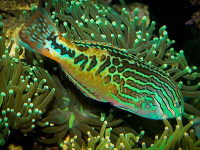 گونه نر و ماده با ظاهری متفاوت قابل تشخیص هستند. یک ماهی نسبتاً مشکل برای نگهداری می باشد زیرا به راحتی با محیط های آکواریومی خو نمی گیرد ولی یک آکواریوم تپه مرجانی بزرگ با بستر ماسه ای عمیق می تواند محیط مناسبی برای نگهداری از این ماهی باشد. این ماهی بسیار فعال و خوش رنگ است و می تواند منظره بی نظیری را در آکواریوم شما به وجود آورد ولی ممکن است چندین روز طول بکشد تا به محیط جدید عادت کرده و شروع به غذا خوردن کند. این ماهی بیشتر از بی مهرگان ریزی که بر روی صخره های زنده زندگی می کنند تغذیه می کند ولی شما می توانید از انواع میگو های کوچک آماده و همچنین غذاهای مخصوص ماهیان گوشت خوار و یا حتی تکه های بسیار کوچک میگو غنی شده با ویتامین جهت تغذیه استفاده کنید.