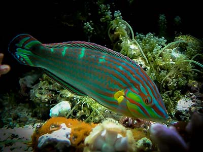 این ماهی قبل از بلوغ و بعد از بلوغ با جنسیت ماده بسیار شبیه به یکدیگر هستند و بعد از بلوغ رنگ و ظاهر جنس نر تغییر کرده و از جنس ماده به سادگی قابل تشخیص است. آکواریومی با ظرفیت ۱۸۰ لیتر و بالاتر به همراه صخره های زنده و بستری با ماسه نرم به ضخامت ۸ تا ۱۲ سانتی متر می تواند برای نگهداری از این ماهی مناسب باشد. این ماهی تمامی حلزون ها و کرم هایی که انگل مرجان ها هستند را شکار کرده و در محافظت از سلامت مرجان ها نقش مهمی دارد. در روز های اول اضافه کردن، این ماهی ممکن است اقدام به خوردن به کرم های لوله ای، میگوهای کوچک و حتی انگل های سطح بدن ساکنین آکواریوم شما کند. می تواند تغذیه این ماهی در روزهای اول معرفی به آکواریوم مشکل باشد. برای تغذیه این ماهی می توانید از میگوی های آرتمیا و بعد از آن مجموعه متنوعی از غذاهای گوشتی دریايي غنی شده با ویتامین استفاده کنید.