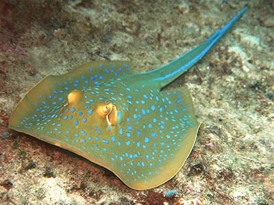 سفره ماهی خال آبی به سفره ماهی دم پری خال آبی نیز مشهور است. یک سفره ماهی کفزی بسیار جذاب است که به مرور زمان حتی می توانید با دست به آن غذا دهید. این سفره ماهی به آکواریومی با گنجایش حداقل 1100 لیتر نیاز دارد که با بستر ماسه ای مناسب پر شده باشد و ماسه های آن فضای لازم جهت پنهان شدن سفره ماهی در زیر ماسه ها را در اختیار آن قرار دهند. این سفره ماهی ممکن است در روزهای اول بیشتر مواقع در زیر بستر مخفی شود و تمامی سخت پوستان موجود در آکواریوم را شکار کند. نکته مهم خار موجود بر روی ساقه دمی این سفره ماهی است که ممکن است به شما آسیب برساند و بهتر است قبل از قرار دادن آن در آکواریوم کوتاه شود. توجه داشته باشید که این سفره ماهی به درصد های پایین مس بسیار حساس است. در ابتدای معرفی آن به آکواریوم لازم است با تکه های کوچک میگو و یا ماهی مرکب که به اصاره سیر آغشته شده است غذا دهی شود ولی در ادامه می توانید آن را با گوشت انواع ماهی و یا میگوهای دریایی تغذیه کنید.