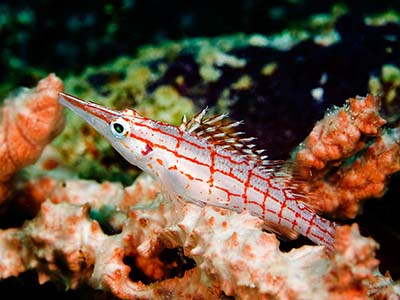 این ماهی با بدنی سفید و چهار خانه های قرمز و پوزه ای بلند بسیار منحصربفرد است. یک آکواریوم با ظرفیت حداقل ۱۰۰ لیتر با صخره های زنده و در بهترین شرایط آکواریوم تپه مرجانی که درب آن به درستی بسته شده باشد می تواند فضای خوبی را برای زیست این ماهی فراهم کند. به ندرت دیده شده که این ماهی رفتار تهاجمی داشته باشد ولی ممکن است از طرف ماهیان دیگر هم خانواده خود تهدید شود. برای تغذیه این ماهی لازم است انواع غذاهای گوشتی غنی شده با مولتی ویتامین را مثل تکه های ماهی و میگو در نظر بگیرید البته می توانید آن را با انواع میگوهای زنده کوچک آب شور مثل آرتمیا نیز تغذیه کنید.