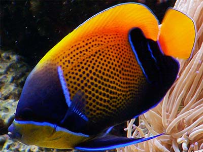 این فرشته ماهی دارای بدنی زرد با لبه ها و هاشور هایی آبی رنگ با بخش های تیره می باشد. نگهداری از این ماهی بسیار ساده تر از اکثر فرشته ماهی ها است. کوچکترین اندازه آکواریوم پیشنهادی برای نگهداری از این ماهی باید ۶۵۰ لیتر باشد و صخره ها و حفره های زیادی برای مخفی شدن در اختیار این ماهی قرار دهد. از این ماهی می توان در آکواریوم های ریف با توجه زیاد در صورتی که در آن مرجان هایی سنگی با پلیپ کوچک و یا انواع مرجان های پلیپی وجود داشته باشد نگهداری کرد ولی این ماهی می تواند به مرجان های نرم و یا مرجان هایی با پلیپ بزرگ و برخی از صدف ها آسیب بزند.