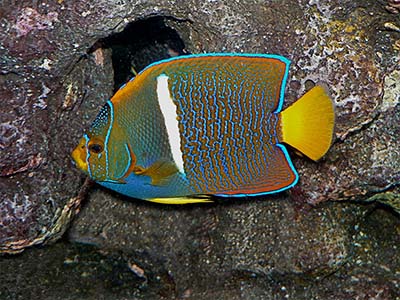 این فرشته ماهی می تواند بیشتر از ۳۰ سانتی متر رشد کند و به آکواریومی با ظرفیت حداقل ۹۰۰ لیتر نیاز دارد. نگهداری از این ماهی مشکل است و رفتار های خشنی از خود نشان می دهد و لازم است با سایر ماهی های نیمه مهاجم نگهداری شود. این ماهی به صخره های زنده و مرجان های نرم و سخت و حتی صدف ها نوک می زند و باعث آسیب آنها می شود و گزینه خوبی برای نگهداری در آکواریوم های تپه مرجانی نیست.
