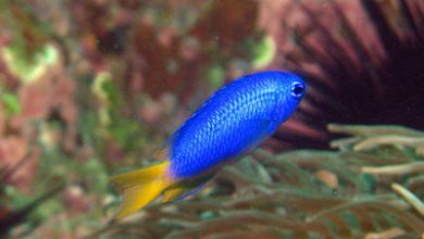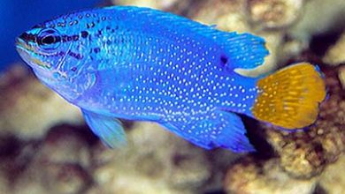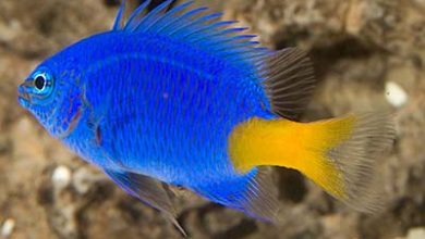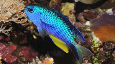 Neon DamselfishPomacentrus alleniPomacentridae توضیح کوتاه این ماهی با بدنی به رنگ آبی بسیار درخشان و باله دمی زرد با لکه…